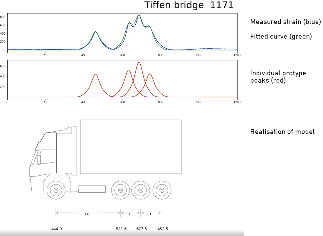 As a load passes over a strain sensor the measured strain rises and then declines. For a given vehicle, a series of axles results in a series of ovelapping peaks in the strain signal. The measurement algoithm works by fitting a combination of prototype peaks to the signal. The algorithm varies the number of peaks, their amplitude and position to obtain the best match to the signal. By measuring the location and amplitude of each prototype peak, the algorithm estimates the position and weight of each axle.
